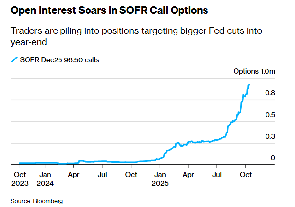 XM账户类型近期与有担保隔夜融资利率(SOFR)挂钩的期权交易显示,交易员正加码押注美联储在本月晚些时候或12月的会议上至少实施一次50基点的降息。这超出了利率互换市场当前定价的两次25个基点的降息幅度。