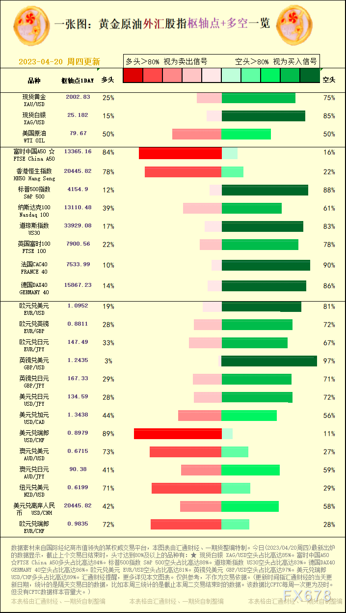 汇通财经APP讯——一张图:黄金原油外汇股指“枢纽点+多空占比”一览。今日(2023/04/20周四)最新出炉的数据显示,截止上个交易日结束时,头寸达到80%及以上的品种有:★ 现货白银 XAG/USD空头占比高达85%。富时中国A50 ☆FTSE China A50多头占比高达84%。标普500指数 S&P 500空头占比高达88%。道琼斯指数 US30空头占比高达83%。德国DAX40GERMANY 40空头占比高达86%。欧元兑美元 EUR/USD空头占比高达81%。英镑兑美元 GBP/USD空头占比高达97%。美元兑瑞郎 USD/CHF多头占比高达89%。汇通财经提醒,更多详见本文图表。仅供参考,不作为交易依据。