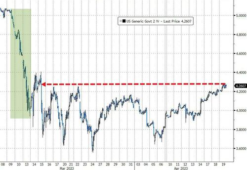 截止周三纽约时段尾盘,2年期美债收益率上涨5.2个基点报4.259%,在上周五突破4%后继续升势不止。目前,这一与美联储利率预期关联最为紧密的收益率,已经逼近了SVB危机爆发后的最高水平。