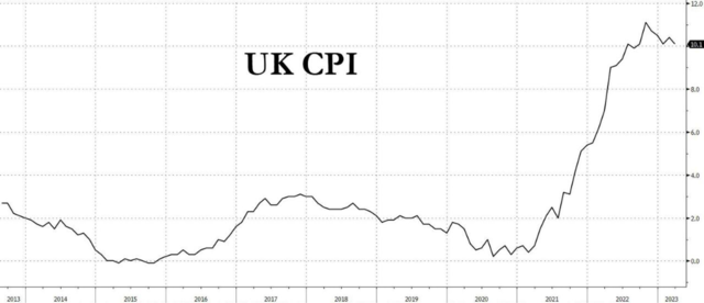 英国国家统计局周三公布的数据显示,3月份英国CPI同比上升10.1%,虽然略低于2月份10.4%的同比涨幅,但远高于经济学家此前预计的9.8%。