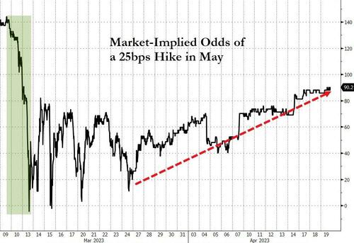 周三,利率期货市场的最新定价显示,美联储在5月2-3日的会议上再加息25个基点的可能性已高达90%。