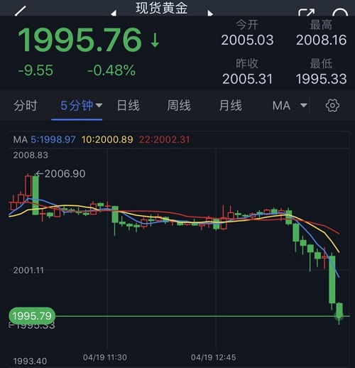 24K99讯 周三(4月19日)亚市尾盘,现货黄金短线突然大幅下挫,金价已经跌破2000美元/盎司大关,目前正逼近1995美元/盎司。知名财经资讯网站Economies.com周三最新撰文,对日内黄金走势进行前瞻分析。