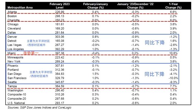 “全美综合指数此前连续7个月下降,2月份小幅上涨0.2%,目前比2022年6月的峰值低4.9%。标普的10城和20城综合指数表现类似,2月份分别上涨了0.3%和0.2%,二者目前分别比各自的峰值低6.0%和6.6%。”拉扎拉称。