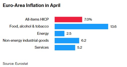 Bloomberg Economics首席欧洲经济学家Jamie Rush表示:“4月份的通胀数据中没有任何实质性的意外上行,这是该报告的主要亮点。GDP增长稳健(但并不出色),信贷状况持续恶化,核心通胀率温和下降,这些因素综合在一起,意味着欧洲央行可能会在周四加息25个基点,而不是再次大幅加息。”