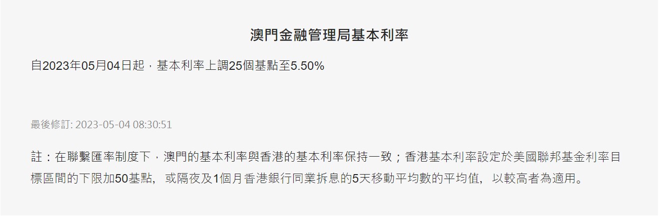 5月4日,澳门金融管理局宣布,即日起,基本利率上调25个基点至5.50%。