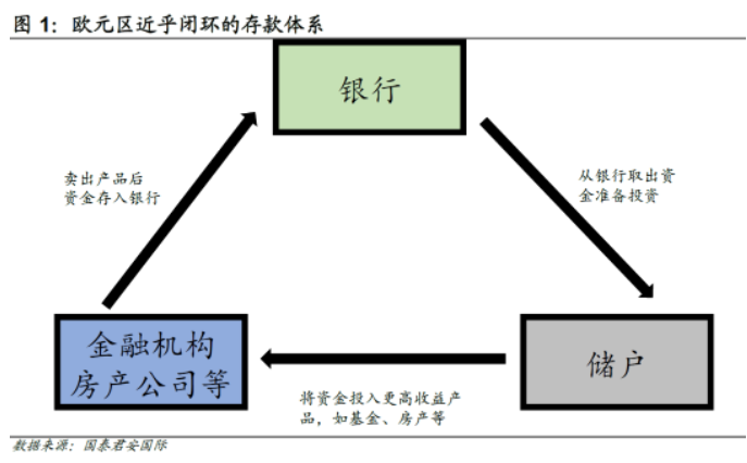 当储户因为利率过低而将存款从银行取出后,会倾向于选择他认为收益相对较高的投资产品,如基金、房产信托;其后金融机构、房产信托等公司会将卖出产品所得的资金再存入银行,从而形成一种近乎闭环的存款体系,总存款大体不会流出银行体系。