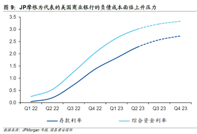 另一方面,从银行角度来看,面临着存款流失的压力,商业银行需要提高利率以吸收储户的存款,这意味着加息的效果开始逐步显现。从市场的主流观点来看,即使美联储在第二季度结束本轮加息,如果在短期内不采取降息,整体银行的负债成本上行也会持续,并可能到2024年初甚至年中才会达到高点。换言之,美联储此前的快速加息对于银行来说可能是“假加息”,而未来美联储停止加息,银行却可能面临着“真加息”。这样的传导也意味着政策决策者可以保持一定的耐心,来观测加息带来的实际效果。