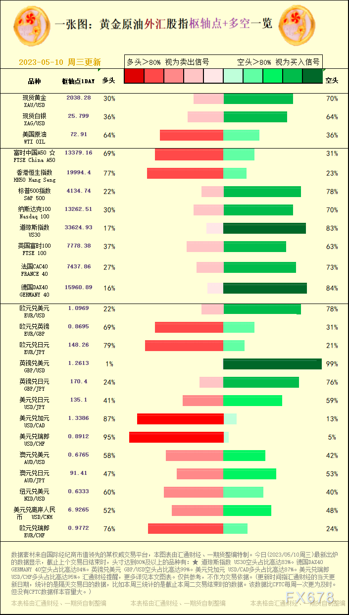 汇通财经APP讯——一张图:黄金原油外汇股指“枢纽点+多空占比”一览。今日(2023/05/10周三)最新出炉的数据显示,截止上个交易日结束时,头寸达到80%及以上的品种有:★ 道琼斯指数 US30空头占比高达83%。德国DAX40 GERMANY 40空头占比高达84%。英镑兑美元 GBP/USD空头占比高达99%。美元兑加元 USD/CAD多头占比高达87%。美元兑瑞郎 USD/CHF多头占比高达95%。汇通财经提醒,更多详见本文图表。仅供参考,不作为交易依据。