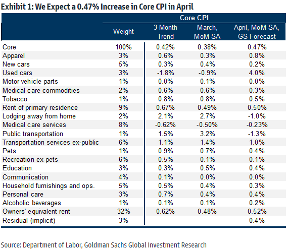 高盛在对CPI前瞻中则预计, 4月份总体CPI将环比上涨0.50%,同比上涨5.09%。 4月份核心CPI将上涨 0.47%,同比上涨5.59%。高盛着重提到了这份CPI数据值得关注的三个趋势: