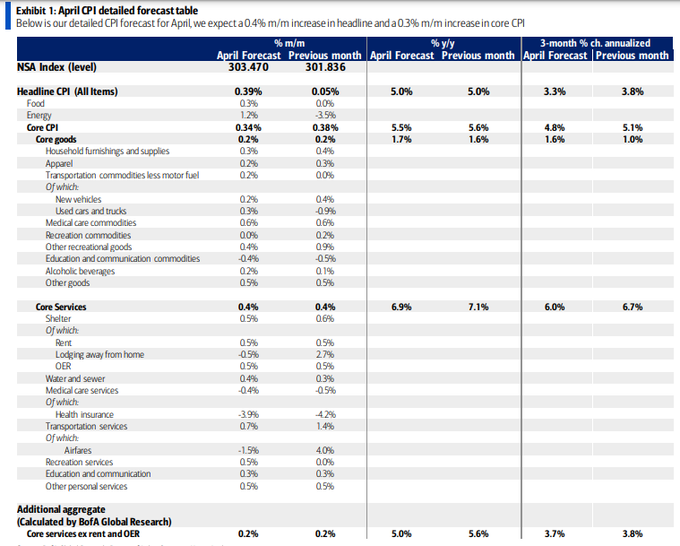 美国4月CPI环比将增长0.39%,其中能源价格增长1.2%;核心通胀环比增长0.34%;核心商品价格增长0.2%,其中新车价格增长0.2%,二手车价格增速从上个月的-0.9%转为0.3%;核心服务业价格增长0.4%,其中,租金和业主等价租金均保持0.5%的环比增速,机票价格从上个月的增长4%转为下跌1.5%。