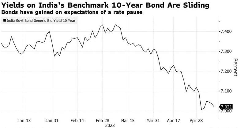 印度央行的暂停加息举措与全球央行的转向一致。美联储上周将利率上调了25个基点,并暗示这可能是目前最后一次加息。这一影响反映在印度的债券市场上,10年期印度国债收益率徘徊在7%左右,为一年多来的最低水平。