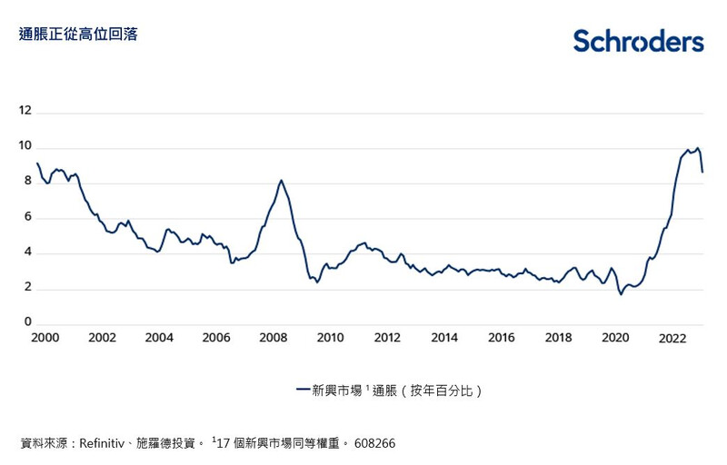 随着整体消费物价指数(CPI) 自高位回落,新兴市场通胀亦出乎意料地在最近数周出现下行情况。数据显示,2023年3月,17个主要新兴市场的整体通胀同等权重平均值按年下跌至9%以下,那是自2023年1月份时从10%的近14年高位回落。