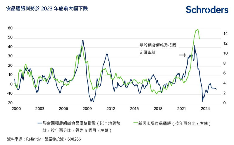 食品通胀亦有望将于未来数月开始大幅下跌。鉴于食品在新兴市场消费者物价指数中所占权重较高,通常所占比例为20-30%,这或将导致整体通胀率大幅下跌。因此,受与商品价格的滞后关系影响,若食品通胀下跌约12%,则新兴市场的平均整体通胀有可能于2023年底或之前下降约3%。