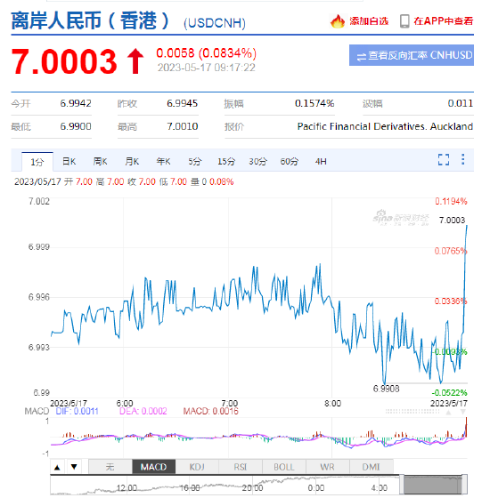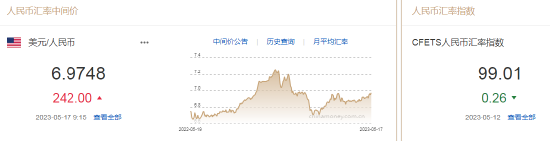 5月17日,人民币中间价报6.9748,下调242点,贬值至2022年12月29日以来最低。离岸人民币跌破7关口。上一交易日中间价报6.9506,在岸人民币上一交易日收报6.9641。