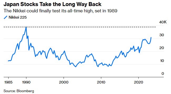 在一些分析人士看来,AT1债券恢复出售是日本信贷市场恢复活力和金融市场的投资者情绪改善的最新迹象,说明市场风险偏好正显著回升。数据显示,日经225指数在上周五收于1990年以来的历史最高水平,一些激进投资者寄希望于该指数最终突破1989年最后一个交易日创下的高点。华尔街大行高盛表示,日本可能正接近十年一遇的牛市。