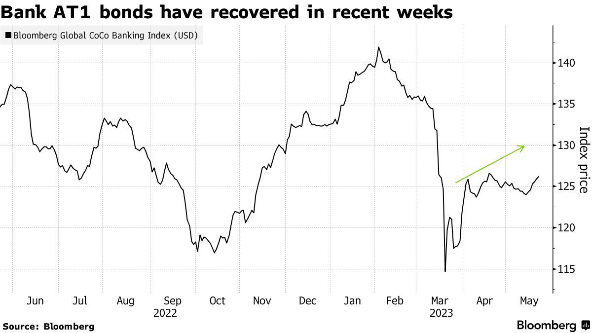彭博指数显示,风险最高的银行债务类型,也被称为依情况而定的可转换债券(contingent convertible bond),最近几周有所反弹,但价格仍低于银行业危机前的水平。