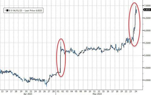 行情数据显示,6月1日到期的短期国库券收益率周三飙升至了7%以上,这是业内普遍预计美国政府在不提高债务上限的情况下可能无法付款的第一天。