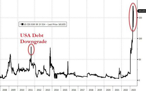 除了债券收益率飙升外,过去一周曾有所回落的1年期美国信用违约互换(CDS)基差,在周三也再度随着市场对冲美债风险的激增而出现了大幅飙升。
