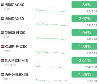欧股跌幅也迅速扩大,普遍大跌2%左右。 富时泛欧绩优300指数初步收跌1.88%。德国DAX 30指数初步收跌2.07%。法国股指初步收跌1.83%,意大利股指初步收跌2.49%,英国股指初步收跌1.97%。