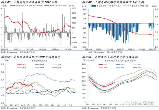 上周美国原油库存减少1247万桶,前值上升504万桶。原油库存量升至4.6亿桶,低于2019年同期水平;战略原油储备减少163万桶,存量降至3.6亿桶。原油产量增至1230万桶,美国天然气库存处于同期较高位置。