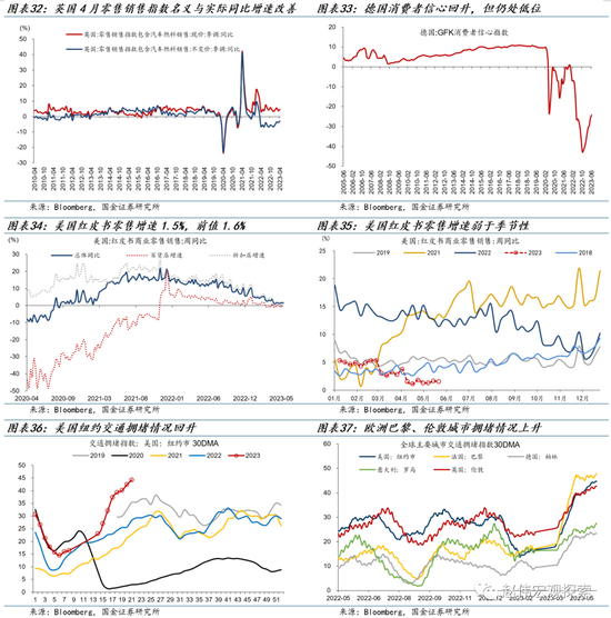 英国零售增速上升,德国消费者信心回升,但仍处低位。英国4月零售销售指数名义同比4.7%,前值3.7%;实际同比-3%,前值-3.9%。德国6月GFK消费者信心-24,前值-26。5月20日当周,美国红皮书零售增速1.5%,前值1.6%。欧美航班出行情况延续回升,纽约拥堵指数延续上升。