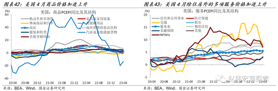 商品PCE通胀及其结构:商品价格加速上升。4月商品分项PCE物价指数同比上涨2.1%,前值1.6%。各分项中,机动车和零部件同比2.3%,前值1.3%;其他耐用品同比4.6%,前值3.6%;服装和鞋类同比3.1%,前值2.1%;汽油及其他能源货物同比-13.5%,前值-20.0%。其中,汽油及其他能源货物拉动商品PCE下降1.2个百分点(前值下降1.9个百分点)。