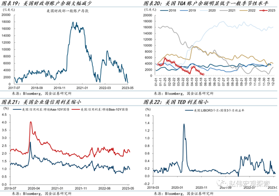 美国TGA账户余额大幅度减少,债务谈判出现进展。截至本周五(5月26日),美国两党针对债务问题的谈判仍在进行,较上周有所进展,拜登及麦卡锡表示谈判接近达成协议。另一方面,美国财政部资金余额大幅减少,截至5月26日,TGA账户余额大幅减少至495亿,明显低于季节性水平,美国主要流动性指标仍处于宽松区间。