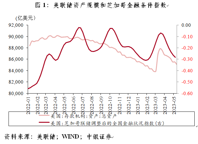 这离不开监管层在风波初期强有力的干预。尤其是美联储对金融风险的重视程度大幅上升,通过BTFP计划以抵押品面值借款给流动性困难的银行,助推美国金融条件趋松。3月底,美联储持有证券规模未按期下降,而贷款放量导致资产总额较2月底增加3.8%;芝加哥金融条件指数在3月短暂收紧后再次明显转松(见图1)。