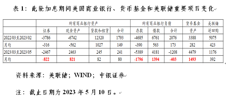 这一次美国储户存款搬家可以总结为两阶段:第一阶段是银行与货币市场基金的温和反应。2022年3月至2023年2月,商业银行面对存款搬家尚可以通过卖出证券资产、消耗现金资产和同业借款来应付。其间,货币基金通过逆回购进入美联储资产负债表,同时也会通过同业市场把银行存款变成银行借款。第二阶段是银行业风波加速银行存款流失。2023年3月1日至5月10日,银行存款下降了5389亿美元。虽然银行依然卖出了证券资产2467亿美元,但已经无法与之匹配。