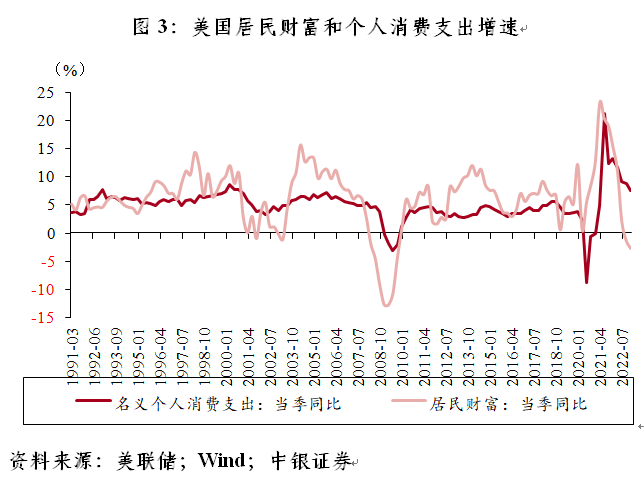 三是美国居民的财富效应。美国居民的财富(总资产—总负债)同比增速领先于消费支出同比增速。2022年四季度,虽然美国居民的财富同比下降2.7%,但是个人消费支出同比依然有7.5%(见图3)。如果金融市场改善提升居民的财富效应,将进一步降低美联储紧缩对消费降温的作用。市场可能在“作茧自缚”。