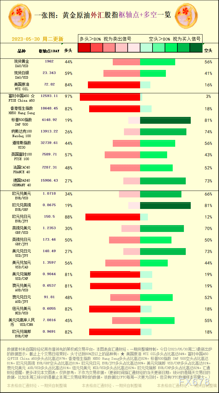 汇通财经APP讯——一张图:黄金原油外汇股指“枢纽点+多空占比”一览。今日(2023/05/30周二)最新出炉的数据显示,截止上个交易日结束时,头寸达到80%及以上的品种有:★ 美国原油 WTI OIL多头占比高达84%。富时中国A50 ☆FTSE China A50多头占比高达97%。香港恒生指数 HK50 Hang Seng多头占比高达82%。标普500指数 S&P 500空头占比高达81%。欧元兑英镑 EUR/GBP空头占比高达81%。欧元兑日元 EUR/JPY多头占比高达88%。美元兑瑞郎 USD/CHF多头占比高达81%。澳元兑美元 AUD/USD多头占比高达81%。纽元兑美元 NZD/USD多头占比高达82%。欧元兑瑞郎 EUR/CHF多头占比高达82%。汇通财经提醒,更多详见本文图表。仅供参考,不作为交易依据。