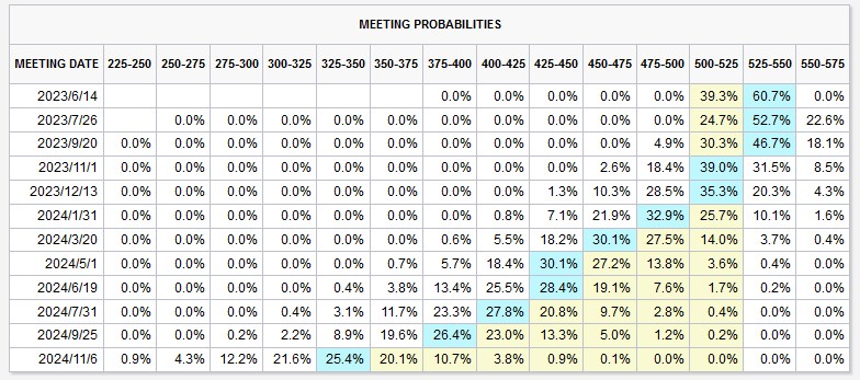 美联储将于6月13日至14日召开政策会议,决定是否有必要再次加息25个基点。CME“美联储观察工具”显示,利率期货市场交易员预计6月加息25个基点的概率为60.7%。