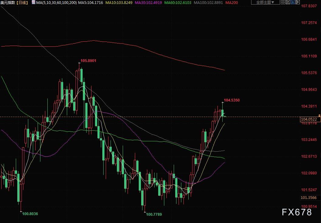 这帮助美元指数在欧洲交易时段达到104.53的10周来最高,但随后回落,一度低见103.870。美元在纽约盘尾下跌0.153%,报104.140,收复了先前的部分失地。