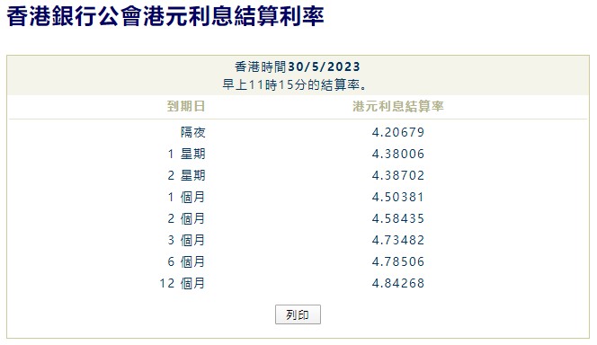 5月30日,港元拆息普遍向上,与楼按相关的一个月拆息报4.50381厘,升5.083基点,连升三日,创一周新高。隔夜息则回落至4.20679厘,跌2.273基点。反映银行资金成本的三个月拆息报4.73482厘,升9.53基点。六个月及一年期拆息分别升6.423基点及7.947基点,至4.78506及4.84268厘。港元汇价今早在7.8231至7.832之间上落,最新报7.8319。
