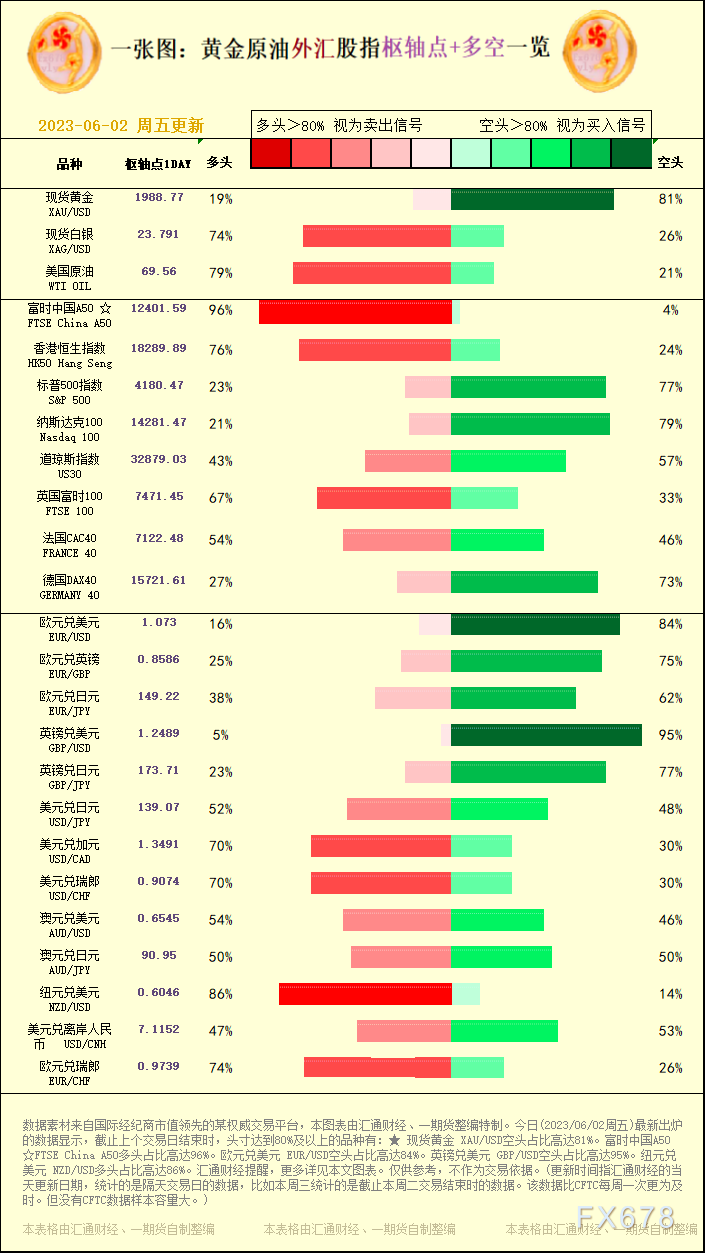 汇通财经APP讯——一张图:黄金原油外汇股指“枢纽点+多空占比”一览。今日(2023/06/02周五)最新出炉的数据显示,截止上个交易日结束时,头寸达到80%及以上的品种有:★ 现货黄金 XAU/USD空头占比高达81%。富时中国A50 ☆FTSE China A50多头占比高达96%。欧元兑美元 EUR/USD空头占比高达84%。英镑兑美元 GBP/USD空头占比高达95%。纽元兑美元 NZD/USD多头占比高达86%。汇通财经提醒,更多详见本文图表。仅供参考,不作为交易依据。