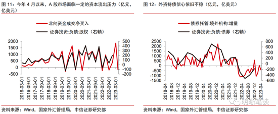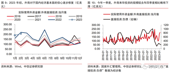 2.非储备性质金融账户流出压力有所缓和,但资本流出的状态尚未改变。直接投资方面,2023年初,随着疫情因素的趋缓以及国内经济预期的改善,外商对于国内经济基本面的信心逐步修复,1月和2月的当月实际使用外商直接投资金额表现较好。但从国际收支维度来看,今年一季度“直接投资:负债”(即外商来华投资)的规模较去年四季度相比略有下滑。证券投资方面,股债市场重现资本外流或为人民币走弱增添一定压力。股市方面,2023年一季度,北向资金维持一定规模的净流入,而步入4月,经济修复斜率有所放缓,弱复苏预期带动市场情绪转弱,A股市场资本流出压力边际增大。债券市场方面,3月外资短暂恢复少量增持,而4月则重回减持状态,显示外资持债信心依旧不稳。往后看,外商来华直接投资或仍面临地缘政治因素的扰动,而吸引外资来华证券投资持续净回流的关键或是未来经济基本面的修复程度和幅度、中美利差等。