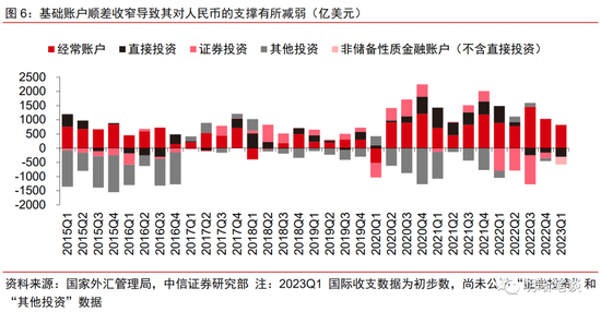 国际收支“一顺一逆”格局延续,基础账户顺差收窄导致其对人民币的支撑有所减弱。2023年一季度,我国国际收支呈“一顺一逆”格局,经常账户在“出口维持一定韧性+进口持续疲弱”的组合下保持一定规模顺差,而非储备性质的金融账户仍是逆差状态。根据国家外汇管理局披露的2023年一季度国际收支初步数,我国基础账户(“经常账户”+“直接投资”)录得518亿美元的顺差规模,无论是同比还是环比维度均有下降,其对人民币的支撑也有所减弱。