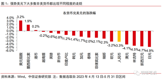 美元再度走强,非美货币承压。今年4月中旬以来,在美国经济相对韧性、通胀粘性略超预期以及美联储官员偏鹰派发言导致市场降息预期回调、债务问题扰动市场风险偏好等因素的共同驱动下,美元指数重现涨势。强势美元下大多数非美货币都出现不同程度的走贬,其中日元兑美元贬值4.9%,欧元、澳元、新西兰元等货币也表现偏弱,同期人民币兑美元贬值幅度达3.3%。