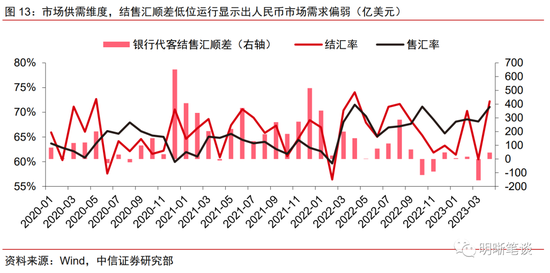 市场供需维度,结售汇顺差低位运行显示出人民币市场需求偏弱。今年以来,银行代客结售汇顺差规模始终维持在低位,其中3月更是录得近155亿美元的逆差。售汇率的居高不下,以及结汇率的大幅波动,显示出市场主体对于人民币的需求偏弱。