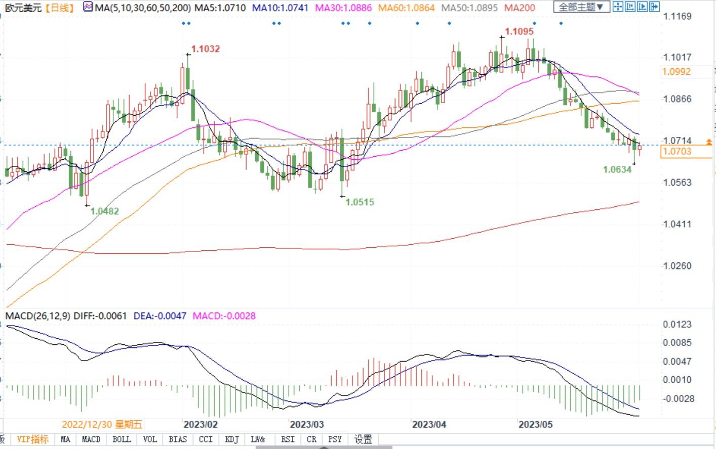欧元兑美元日线图北京时间6月1日20:40,欧元兑美元报1.0696/1.0697