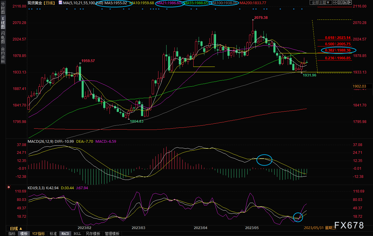 日线级别:震荡下跌后反弹;KDJ金叉,金价在100日均线附近获得支撑后反弹,目前回升至5日均线和10日均线上方,在失守5日均线1955.01前,金价短线存在进一步反弹机会,初步阻力在隔夜高点1974.62附近,进一步阻力在1980关口,强阻力在1988.65附近,该位置是2079-1932跌势的38.2%回撤位,55日均线和21日均线阻力也在该位置附近,若能收复该位置,则增加后市看涨信号。