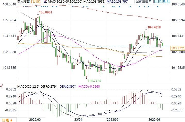 美元指数日线图北京时间6月13日13:50,美元指数报103.36