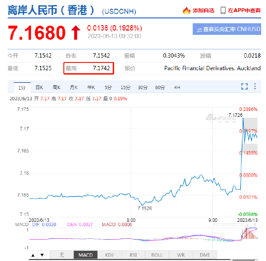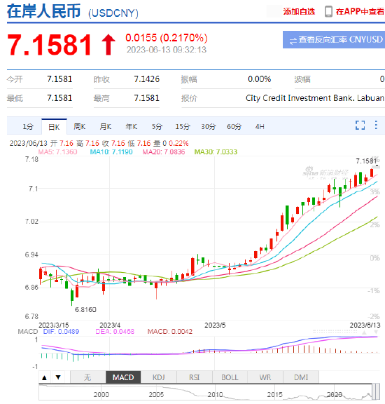6月13日,离岸人民币兑美元一度跌破7.17关口。