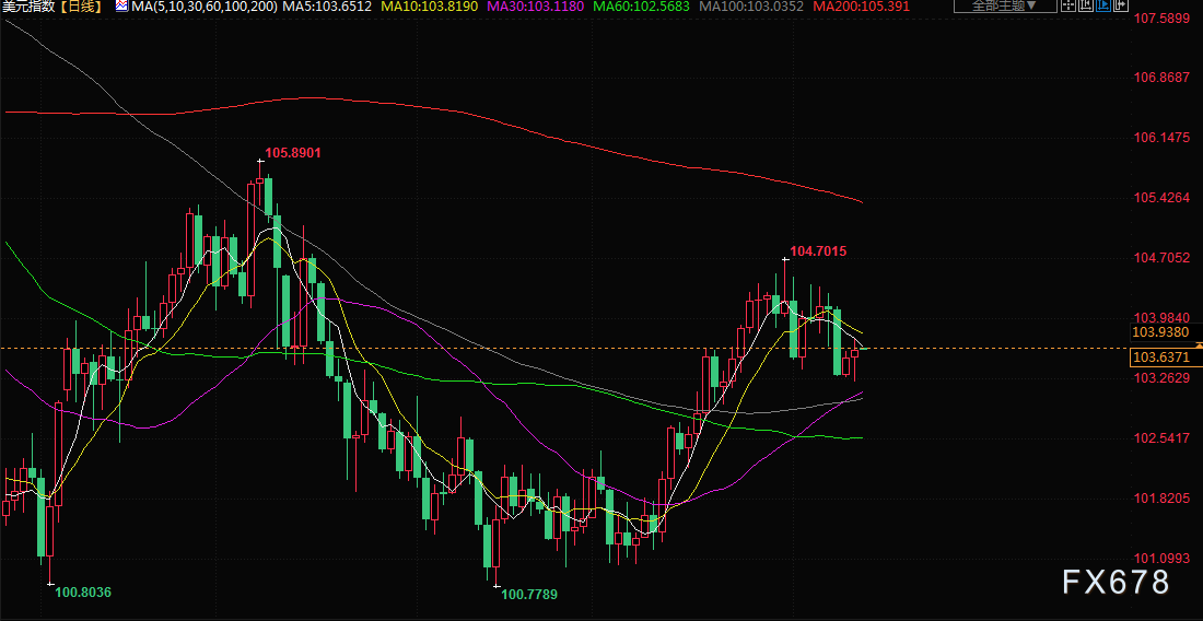 美元指数纽约盘尾上涨0.1%,报103.64,上周下跌近0.5%,创4月中以来最大单周跌幅。欧元持平于1.0753美元,上周上涨0.4%,为大约一个月以来的首次周线涨幅。