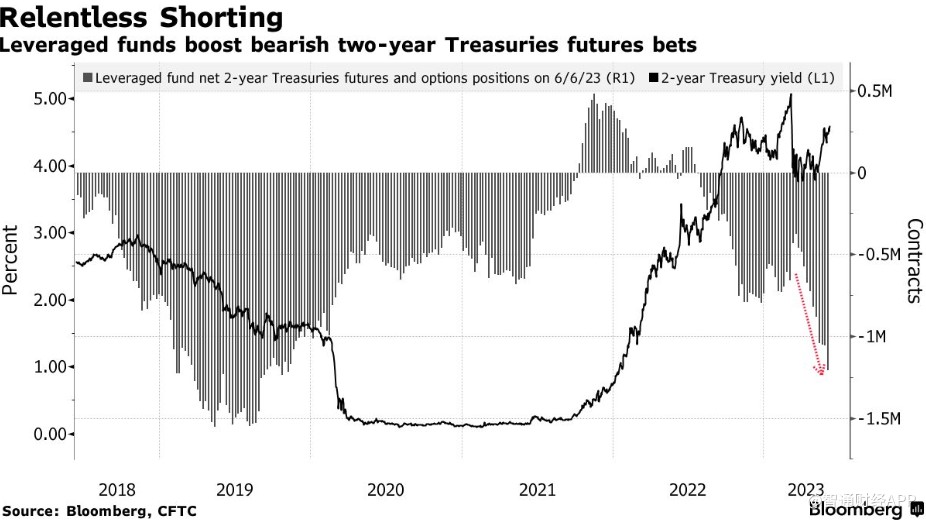 对冲基金继续创纪录地抛售短期美国国债,押注美联储与通胀的斗争远未结束。美国商品期货交易委员会的数据显示,截至6月6日,杠杆投资者连续第11周增持两年期美国国债的净空头头寸,这是2006年有记录以来最长的一次。