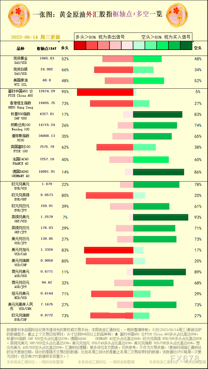 汇通财经APP讯——一张图:黄金原油外汇股指“枢纽点+多空占比”一览。今日(2023/06/14周三)最新出炉的数据显示,截止上个交易日结束时,头寸达到80%及以上的品种有:★ 富时中国A50 ☆FTSE China A50多头占比高达95%。标普500指数 S&P 500空头占比高达83%。德国DAX40 GERMANY 40空头占比高达86%。欧元兑英镑 EUR/GBP多头占比高达80%。英镑兑美元 GBP/USD空头占比高达93%。美元兑加元 USD/CAD多头占比高达83%。美元兑瑞郎 USD/CHF多头占比高达80%。澳元兑美元 AUD/USD空头占比高达89%。汇通财经提醒,更多详见本文图表。仅供参考,不作为交易依据。