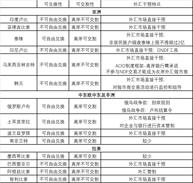 具体包括:1.亚洲:印度卢比(INR)、菲律宾比索(PHP)、泰铢(THB)、印尼卢比(IDR)、马来西亚林吉特(MYR)、韩元(KRW);2.中东欧中东及非洲:俄罗斯卢布(RUB)、土耳其里拉(TRY)、波兰兹罗提(PLN)、南非兰特(ZAR);3.拉美:墨西哥比索(MXN)、巴西雷亚尔(BRL)、阿根廷比索(ARS)、智利比索(CLP)。