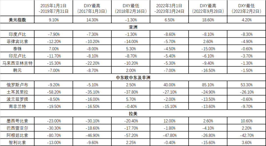 表1 两轮加息周期中主要新兴市场货币表现