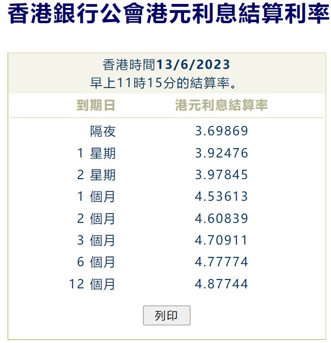 6月13日,香港银行公会数据显示,港元拆息普遍上升,仅隔夜及一年期走低。与楼按相关的一个月拆息连升五天,报4.53613%,创三周新高,与同期美元LIBOR息差略为扩阔至73基点。反映银行资金成本的三个月拆息,亦涨至4.70911%,见一周新高,与同期美元LIBOR息差收窄至84基点。但隔夜息连跌两天,报3.69869%,一年期拆息亦回落至4.87744%。