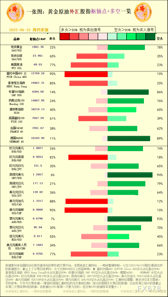 汇通财经APP讯——一张图:黄金原油外汇股指“枢纽点+多空占比”一览。今日(2023/06/15周四)最新出炉的数据显示,截止上个交易日结束时,头寸达到80%及以上的品种有:★ 富时中国A50 ☆FTSE China A50多头占比高达90%。香港恒生指数 HK50 Hang Seng多头占比高达80%。标普500指数 S&P 500空头占比高达86%。德国DAX40GERMANY 40空头占比高达89%。欧元兑英镑 EUR/GBP多头占比高达82%。英镑兑美元 GBP/USD空头占比高达94%。美元兑加元 USD/CAD多头占比高达88%。美元兑瑞郎 USD/CHF多头占比高达90%。澳元兑美元 AUD/USD空头占比高达93%。汇通财经提醒,更多详见本文图表。仅供参考,不作为交易依据。